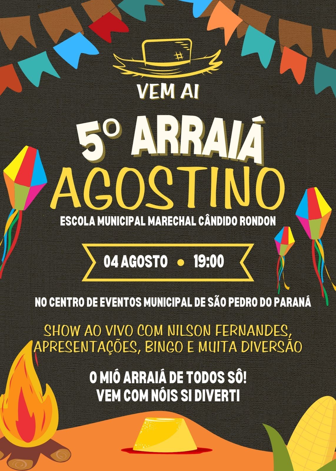 No dia 04 de agosto, às 19h no Centro de Eventos Municipal de São Pedro do Paraná, acontecerá o 5º Arraiá Agostino da Escola Municipal Marechal Cândido Rondon.